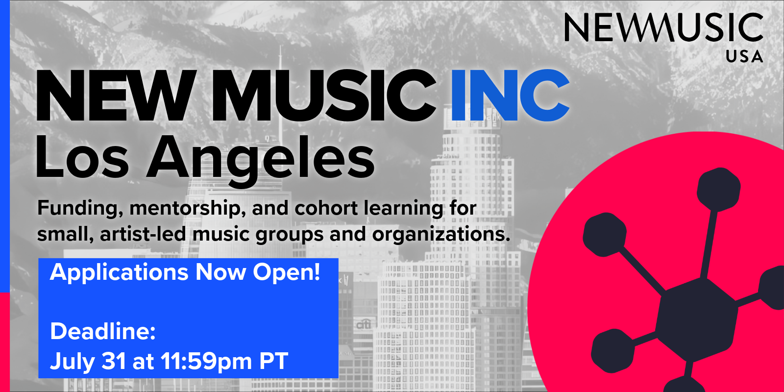 New Music USA announces the opening of applications for New Music Inc Los Angeles (NMI LA). NMI LA is an incubator program designed to help small, artist-led music organizations in Los Angeles generate new ideas, strategies, and collaborations. Made possible by the Music Man Foundation and Perenchio Foundation, the program is open to Los Angeles-based music organizations — including performance groups, ensembles, collectives, record labels, festivals, presenters, and venues — with operating budgets between $10,000 and $500,000. The deadline to apply is July 31, 2025, at 11:59pm PT. The 17-month program will begin in late September.