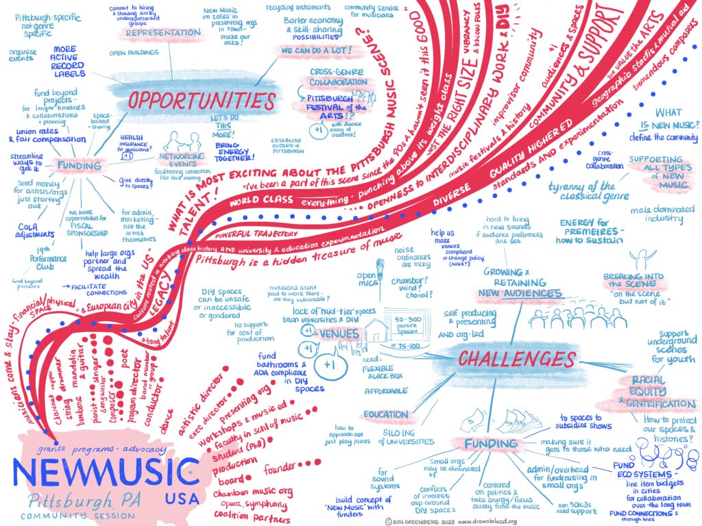 New Music USA recently hosted community meetings in Pittsburgh and in New York City with local music creators, performers, organizers, and non-profit leaders in each city to discuss the current opportunities and challenges faced by each community member, and by the city’s music scene as a whole. The groups also discussed how people within the community may be able to collaborate in different ways, as well as what New Music USA can do as an advocate to influence other funders about what they need to thrive in the work they do.