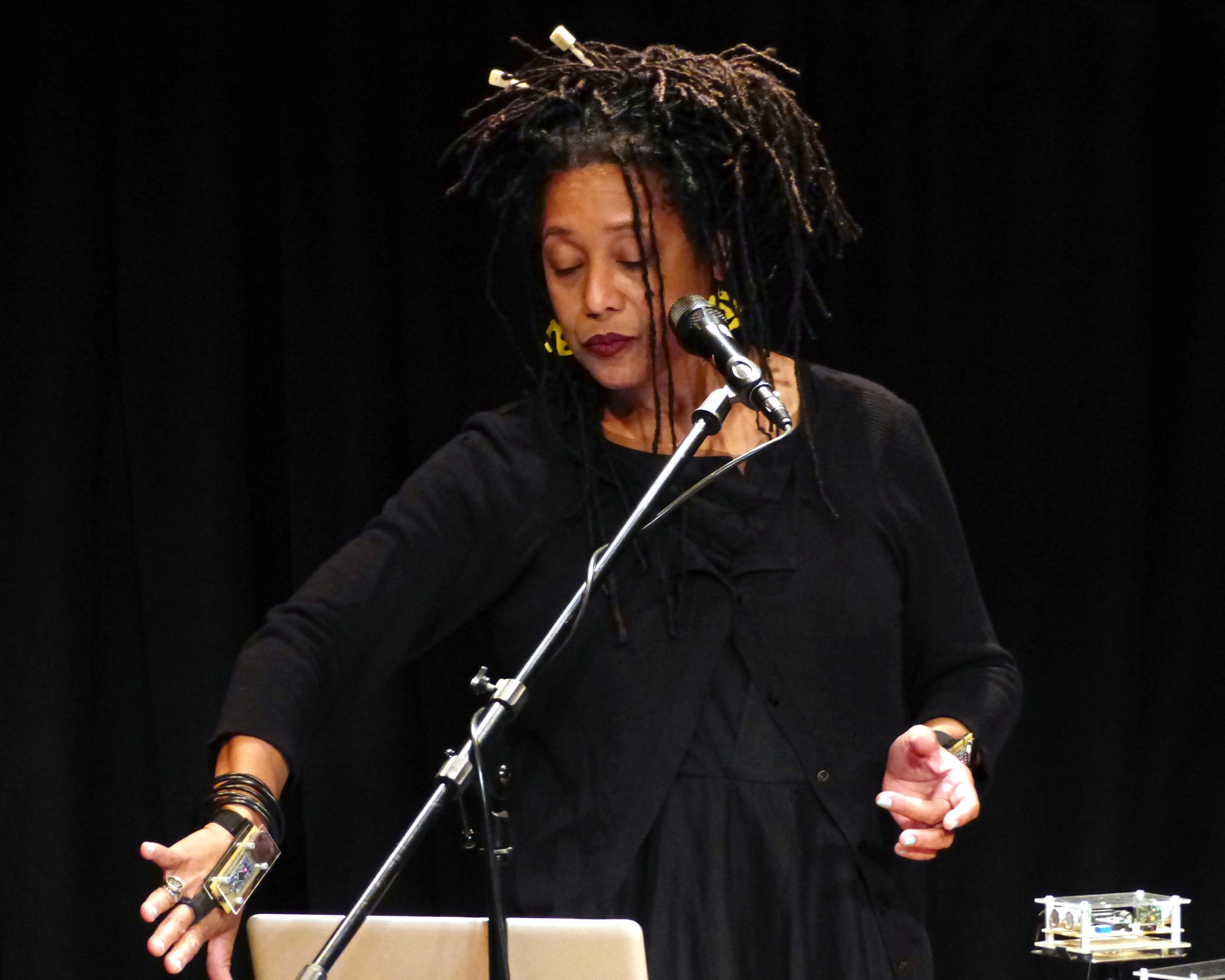 Pamela Z in her studio in 2015 wearing one of the electrode sensors she uses to trigger various sounds. (Photo by Goran Vejvoda)