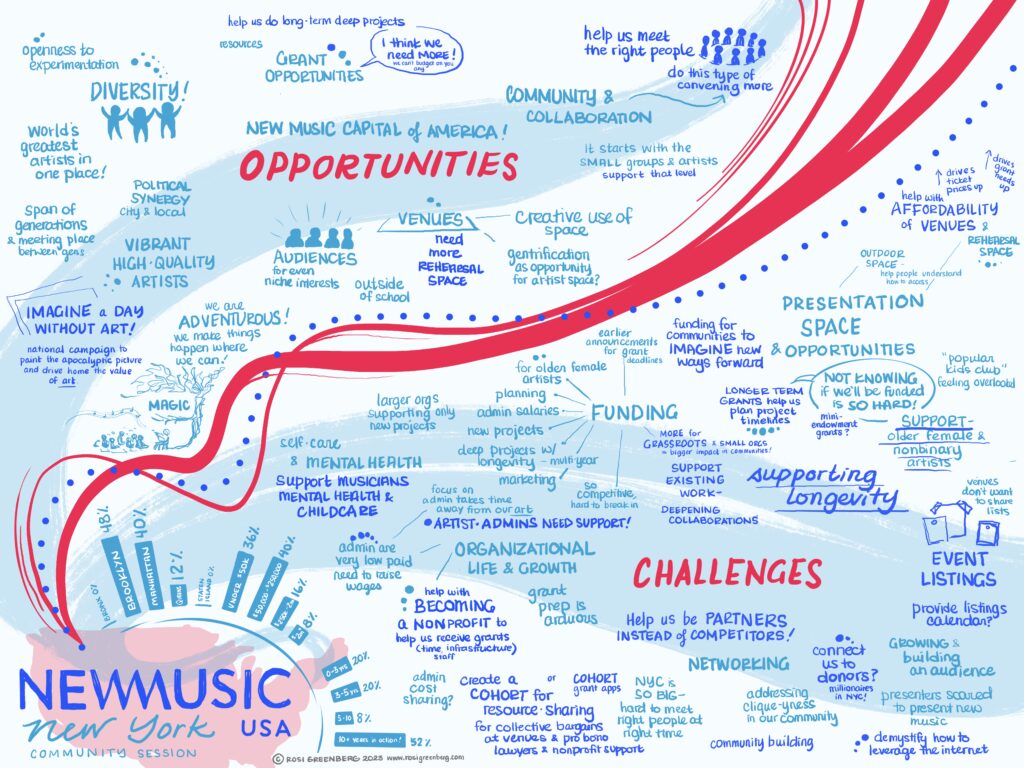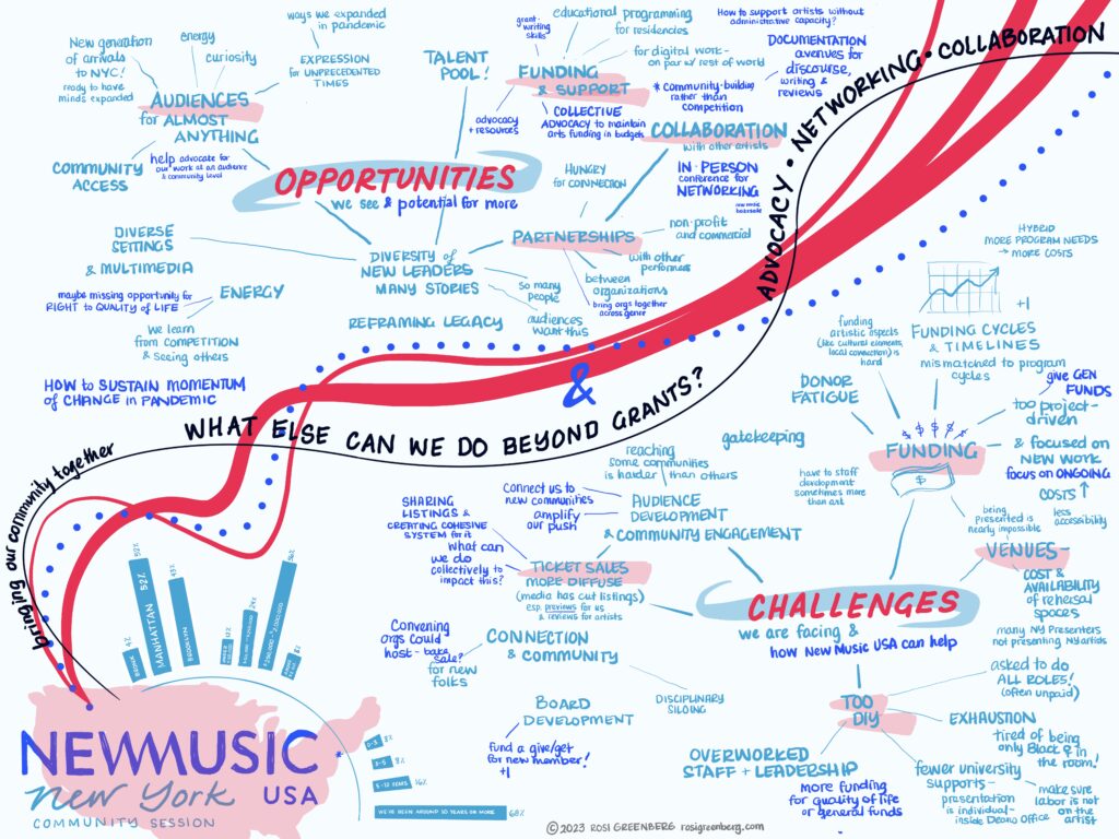 Both meetings featured thoughtful and important insights from community members from varying backgrounds, experiences, and genres in the music community. We enlisted the help of illustrator Rosi Greenberg to provide graphic notations to bring these dynamic conversations to life; check out her beautiful illustrations for each city below.
