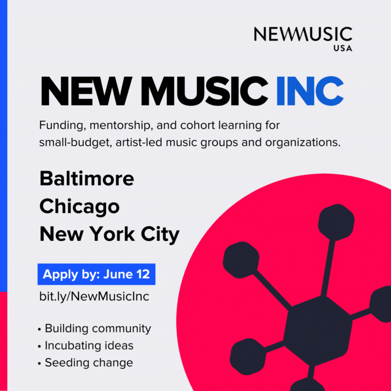 New Music USA today launches New Music Inc—an incubator program designed to help small-budget, artist-led music organizations generate new ideas, strategies, and collaborations at pivotal stages in the group or collective’s development. This program, which reflects New Music USA’s aim to grow its services across multiple US cities over the next 5 years, is now open in Baltimore, Chicago, and New York City. It will provide participating organizations with financial support coupled with hands-on skill building in a cohort environment intended to foster collective learning and collaboration within and between the three cities.